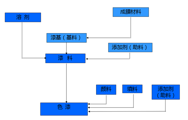 色漆主要(yào)是由(yóu)漆基(jī)(基料)和顏料、溶劑所(suǒ)組成。漆基塗料(liào)中的不揮發部分,它能形成塗膜,並能粘結顏料。溶劑是(shì)一(yī)種在(zài)通常幹燥條件(jiàn)下可揮發的,並能完全溶解漆基德單一或混合的液體(tǐ)。必要(yào)時還用一些添加劑亦(yì)稱助劑。色漆的組(zǔ)成按成膜構成中的(de)作用來劃分,可分為揮發分(fèn)不揮發分(fèn)兩大(dà)部分。